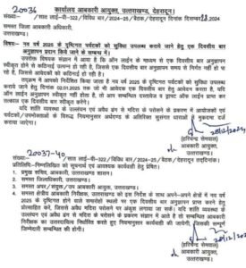 इस क्रम में आपको निर्देशित किया जाता है नव वर्ष 2025 के दृष्टिगत पर्यटकों को सुविधा उपलब्ध कराये जाने हेतु दिनांक 02.01.2025 तक जो भी आवेदक एक दिवसीय बार हेतु आवेदन करता है, यदि ऑन लाईन अनुज्ञापन स्वीकृत नहीं होता है, तो आप सम्बन्धित दस्तावेज व ड्राफ्ट ऑफ लाईन प्राप्त कर तत्काल एक दिवसीय बार स्वीकृत करेंगे।